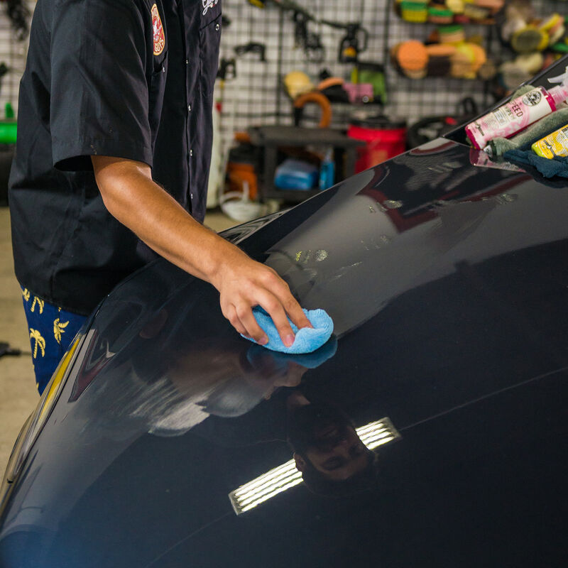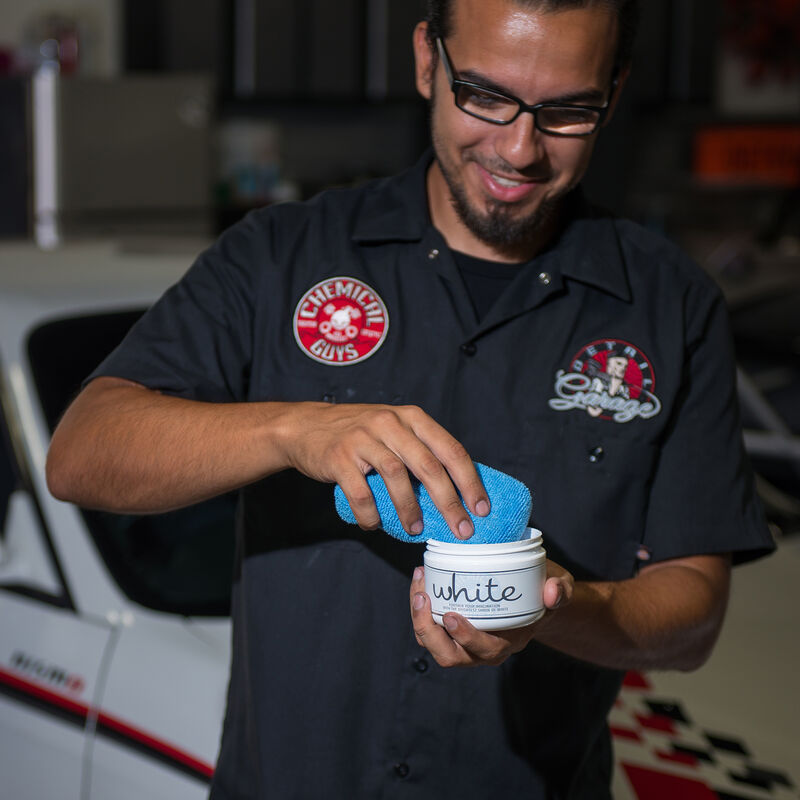 - Apply 3 - 6 dots of any Chemical Guys cream or gel product onto the applicator pad.