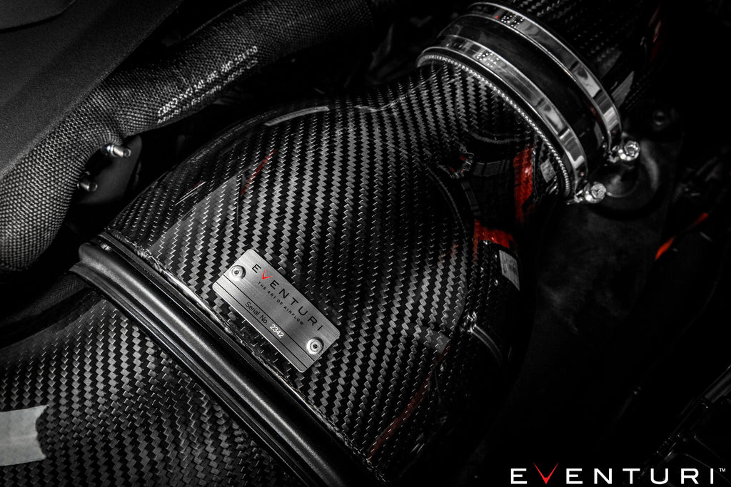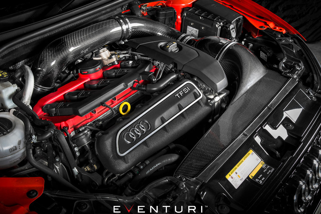 The Audi 8V RS3 Eventuri intake sets a new benchmark in aftermarket intake design for this platform. It was developed to achieve two objectives – 1) De-restrict the turbo inlet path. 2) Maintain low inlet temperatures. The first objective was met by using 88mm internal diameter tubing all the way to the turbo as well as using Eventuri's unique Venturi housing to maintain laminar flow. The second objective was met by designing a sealed system to the stock cold air feed therefore ensuring the turbo does not draw heated air from the engine bay. The intake duct draws air from the stock feed and has been maximised in volume to allow the highest flow rate through the filter. The resulting performance gains and aesthetics are industry leading for the 8V RS3.