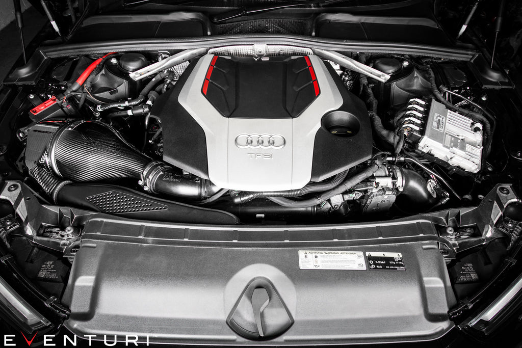 The Audi B9 S4/S5 Eventuri intake was developed to give less restrictive airflow to the turbo whilst maintaining low inlet temperatures. The S5/S4 engine bay becomes heat soaked very quickly so simply having an open cone system would result in better airflow but with higher inlet temperatures. Eventuri therefore completely re-engineered the inlet track from the turbo inlet pipe to the front grill with a highly efficient sealed system. The restrictive stock airbox and flexible plastic inlet pipe have been replaced with a Venturi filter housing and a duct system with smooth transitions. Furthermore, by removing the convoluted stock inlet pipe and replacing it with Eventuri's one-piece Venturi housing and solid tube, the airflow is much smoother as it enters the turbo inlet tube. The resulting performance gains and aesthetics are industry leading for this platform.