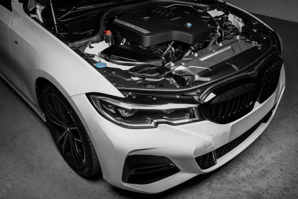 The BMW G20 B48 Eventuri intake has been developed to provide the turbo with a less restrictive flow path whilst maintaining low inlet temperatures. Heat and Volume are the main considerations when designing an intake for turbocharged engines. In the G20, the intake system is located next to the exhaust manifold which rapidly heat soaks the engine bay. High temperatures are detrimental for engine performance as the turbo would have to build boost with heated, less dense air and so the only way to ensure IAT’s are kept to a minimum is for a fully sealed intake. This however, results in a restriction with only one stock air feed to draw air in from. During development we noticed an additional opening into the wheel arch area and took advantage of this by adding a secondary feed to our airbox. Furthermore our sealed airbox also has a heat shield with gold reflective to minimise the radiative heat transfer from the exhaust manifold. In order to maximise volume we made the airbox as large as possible with a recess for potential strut braces. The stock convoluted intake tube is replaced with a smooth carbon tube which is also larger in internal volume with a starting internal diameter of 111mm (4.4″) smoothly tapering down to match the turbo inlet. The tube provides a smooth path from the filter to the turbo inlet. Finally we use a custom made high-flow dry filter which is ISO tested for filtration performance and has a larger filtration area than the stock filter.