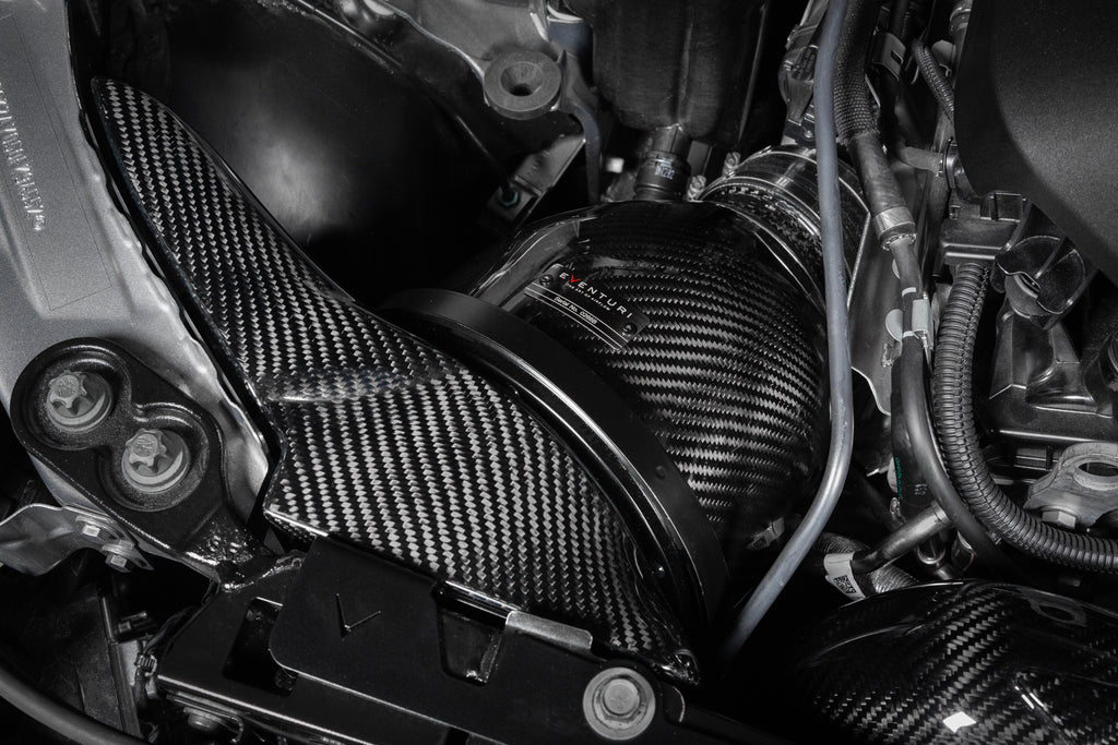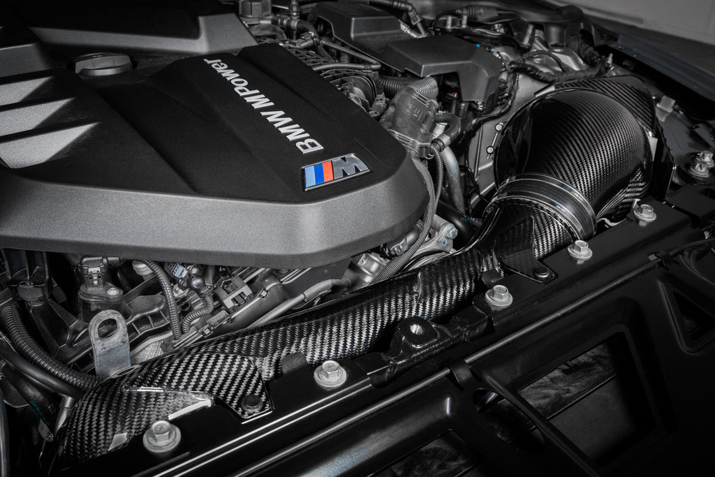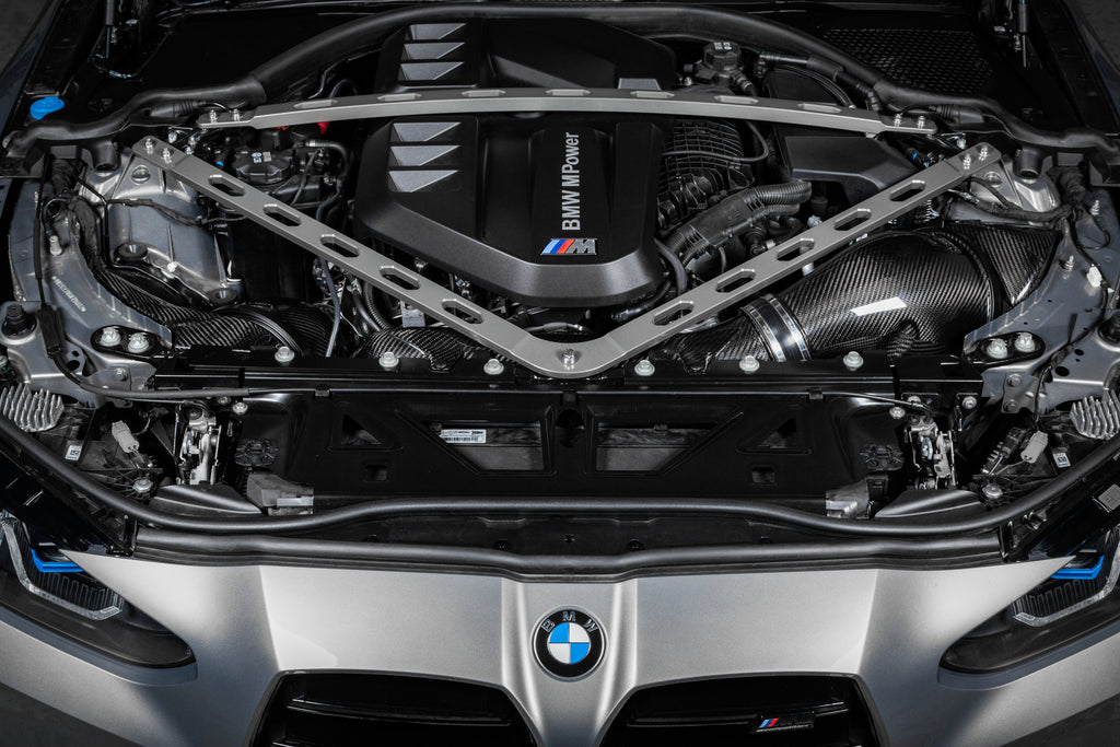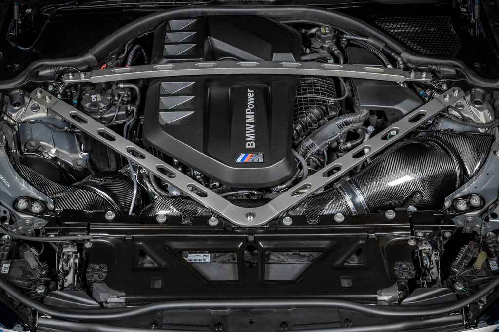 Presenting our revised G8X M2 / M3 / M4 intake for fitment with the CSL Strut brace, which truly sets a benchmark for the BMW G8X M2/M3/M4 platform. We have carried out intensive R&D to develop an intake which not only improves on the stock M2/M3/M4 but also is future proof in its capacity to cater for high powered builds well in excess of 1000hp. Our system is a complete redesign from the airboxes to the turbo inlets with the aim of reducing pressure loss while increasing the flow rate and keeping inlet temperatures low. We have maximised the usage of the available space to employ 2 custom made filters with a 40% larger filtration area than stock. These are used in our Patented Venturi housings to smoothly funnel the air to the turbo inlets. The inlets themselves are up to 160% larger in cross sectional area than stock and are designed with an advanced dimpled inner surface to reduce frictional losses between the flow and the wall boundary. By allowing a “cushion” of air at the wall surface, airflow is able to move through the inlets at higher flow rates with reduced pressure loss. This allows the turbos to draw air with less resistance and therefore reduce the wastegate duty cycle resulting in higher overall performance.