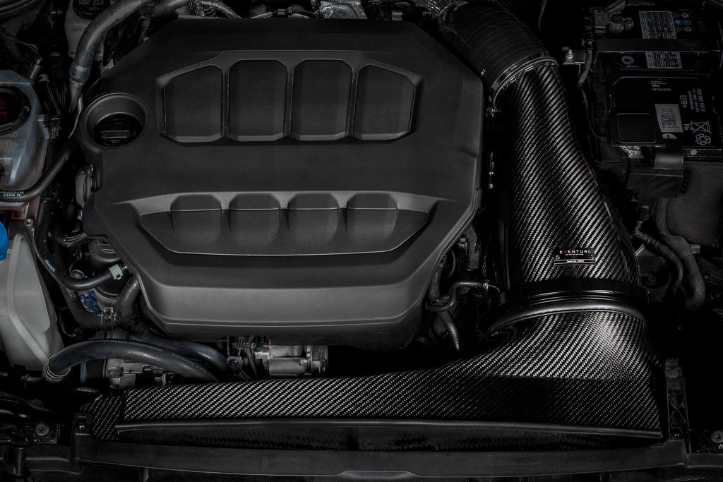 The MK8 Golf GTi/R intake is a complete redesign of the stock intake all the way to the turbo inlet. Taking cues from our RS3 intake, we have maximised usage of the available space to create an intake which can cater for all power levels from stock to high power builds with hybrid or full frame turbos. This intake system has been developed to offer the highest possible flow rate whilst maintaining the lowest intake temperatures possible. Each component has been designed to provide the turbo with a smooth and free flowing path. The restrictive stock 73mm diameter inlet tube is replaced with a larger 94mm diameter tube intake tube. The filter itself has an outer diameter of 192mm or 7.5″ with a filtration surface area of over 110,000mm^2. The patented Venturi housing has been designed to provide the maximum internal volume possible for the Golf engine bay space available and provides laminar flow to the turbo tube. Finally the duct seals the filter opening to the front slam panel but is not restricted by just the stock entry feed. We have lifted the front of the duct to now provide an extra opening behind the hood which is equivalent to an extra 7″ diameter hole for the intake to draw from. The resulting system can significantly outflow the stock airbox while keeping intake temperatures at a minimum with the sealed design.