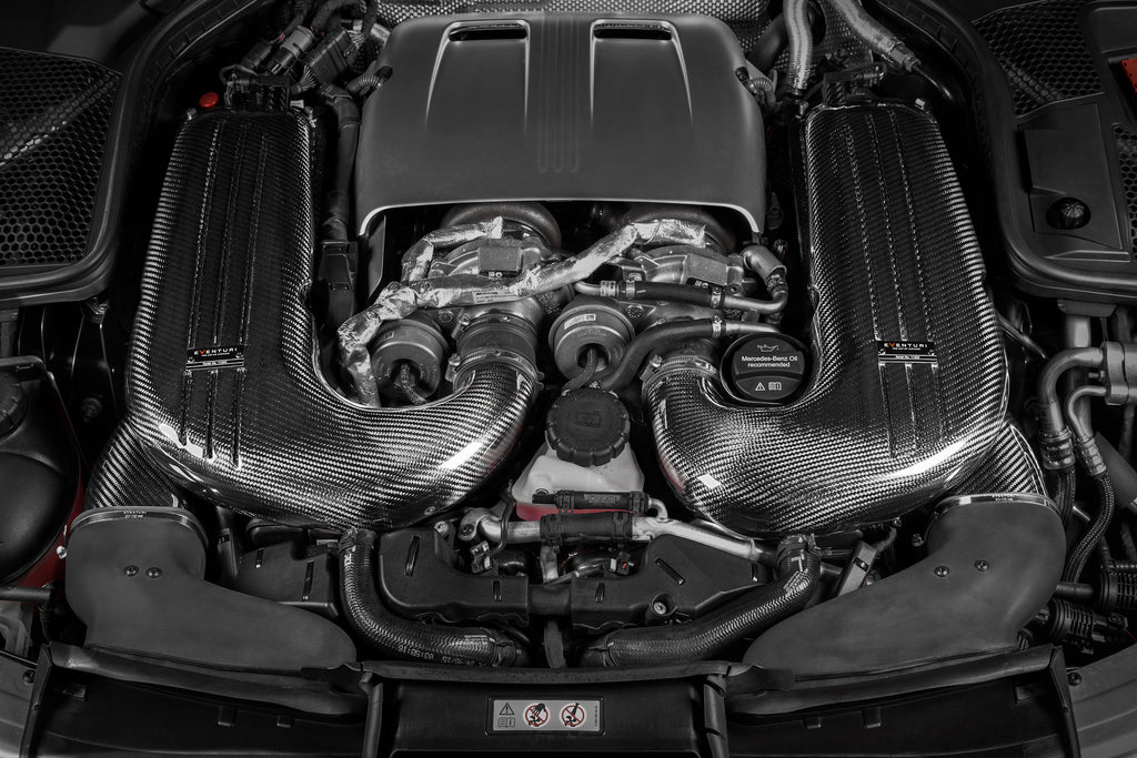The Mercedes W205 C63S AMG intake system is the culmination of extensive development and testing. Our design brief consisted of 3 main objectives: 1) Increased flow rate. 2) Low intake temperatures. 3) Smooth airflow. The first objective was met by utilising all of the limited space available in the C63S engine bay resulting in a 39% higher flow rate over the stock system. The second objective was met by designing a fully sealed system. The C63S engine bay reaches high temperatures with heat sources like the turbos in close proximity to the intake so it is crucial that the intake remains sealed. The final objective was met by designing an organically shaped system with custom rounded panel filters to ensure the airflow path contained no sharp corners and therefore allowed for the flow to remain laminar. With smooth transitions from the filters to the turbo inlets, our intake minimises the formation of turbulence and therefore the turbos are able to operate more efficiently.
