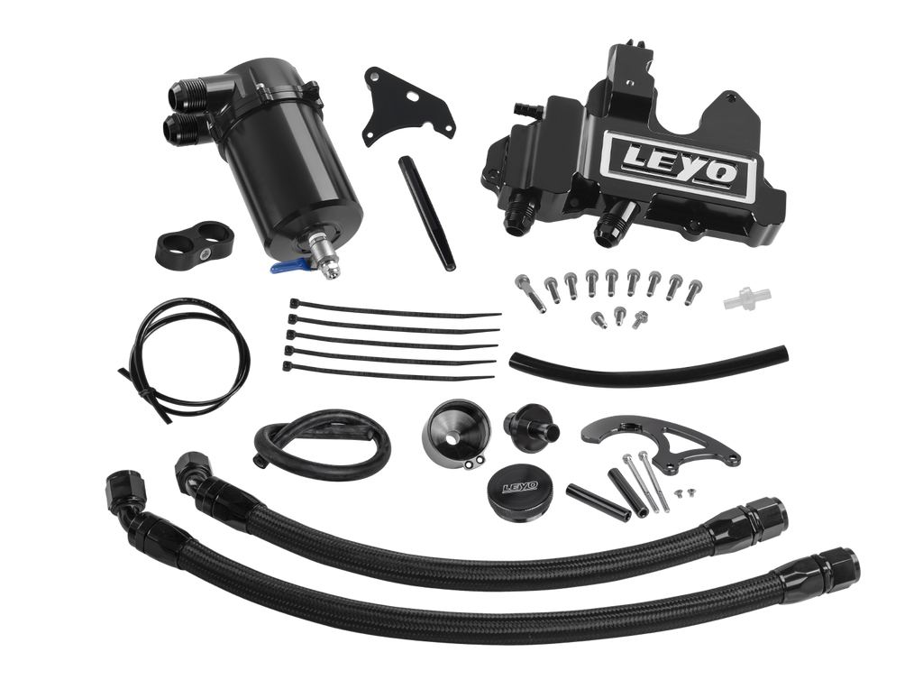 LEYO Oil Catch Can Kit Plus with the new washer bottle delete integrated onto the MK7 oil catch can, owners of MK7 R and Audi S3 8V can now protect the engine with LEYO Oil Catch Can Kit Plus. Our new washer bottle delete frees up the space taken by the top part of the washer bottle so that you have space for our Oil Catch Can. The aluminum washer bottle delete beautifully replaces the top section of the washer bottle while not disrupting the functionality of your washer. Also known as blow-by, oil vapor is produced under load, spirited driving elevates oil vapor level at an incredible rate, it is then circulated back into the intake tract resulting in carbon buildup of the intake valve, trapped oil residuals in both intake tract and intercooler. Unfiltered recirculated oil vapor will not only diminish performance, but also impose devastating effect to the engine.